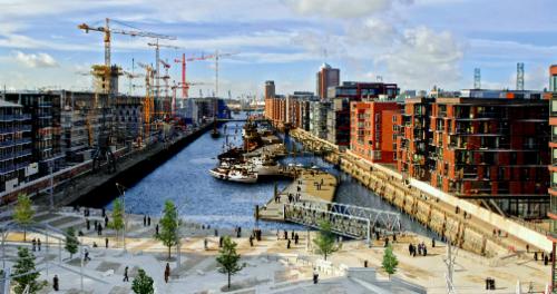 Hamburg hat ca. 1,78 Millionen Einwohner, dazu kommen noch 4,4 Millionen aus der Metropolregion. Zwischen historischer Speicherstadt und Elbe entsteht eine neue City mit einer dichten urbanen Mischung aus Wohnen, Dienstleistung, Kultur und Handel. Die hafentypischen Strukturen sollen dabei erhalten bleiben.
